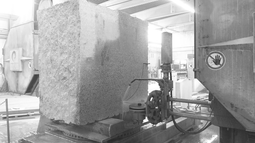 Nach der Spaltsprengung wird der Rohblock einer ersten Sichtprüfung unterzogen (die Rillen stammen von den einzelnen Bohrungen für die Sprengladungen). Nach dem „Anschnitt“ wird die Fasshöhe und der Deckel mit der Diamantseilsäge aus dem Quader geschnitten. (Abb.1)